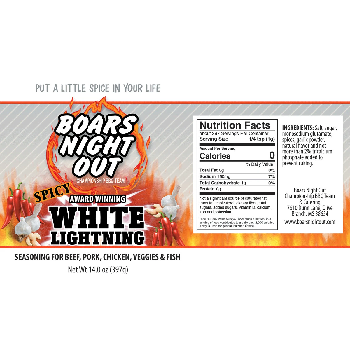 Boar’s Night Out Spicy White Lightning Rub is so good it should be illegal. Great on beef, pork, chicken, veggies, and more. All the great flavor you love from White Lightning with a kick of heat!