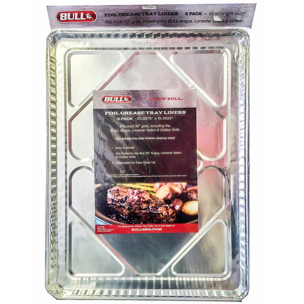 Keeping a drip tray clean in a gas grill can be quite the task! Over time – grease, barbecue sauce, charred meats, and other things collect in the tray, leaving you with a mess. Bull Outdoor Products has created a product to simply clean your drip tray in as little as five seconds. With the Grease Tray Foil Liners (24255) from Bull BBQ cleaning your drip tray is done in a matter of five seconds. Simply place the fresh foil liner in your drip tray, in 6-8 weeks (depending on use), simply remove it and your drip tray is clean. Never stress about a grease fire or old food sitting in your grill again, with the Bull BBQ foil liners, your grill will stay clean all year round. The Bull BBQ (24255) grease tray foil liners only fit 30-inch Bull BBQ grills (Outlaw, Lonestar Select or Angus). Foil pans can also be used for indirect cooking and flavoring foods. It can also be used for roasting a number of items on the grill surface.