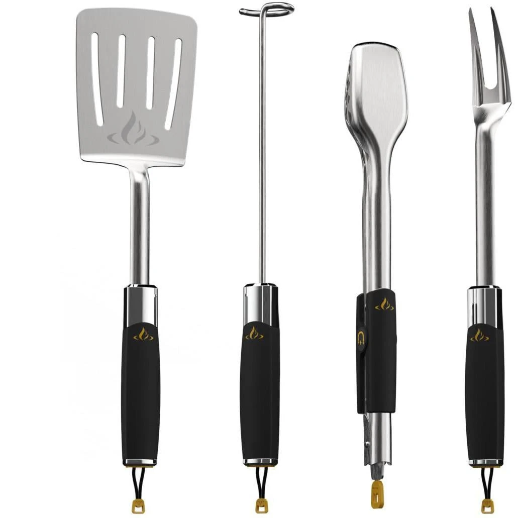 This 4-piece kit includes the essentials, but it is far from basic. These tools are durable, highly functional, and have everything you need to get started. Each item balances strength and comfort and features a strong stem to combat bending and deformation over time. What really sets these tools apart is the built-in magnet nested in each handle. This allows you to hang your tools from any magnetic metal surface, including Halo Outdoor Countertop Cart tool hooks (sold separately). The kit includes a wide slotted spatula, thick-headed tongs, a heavy gauge meat fork, and a sturdy pig tail hook.