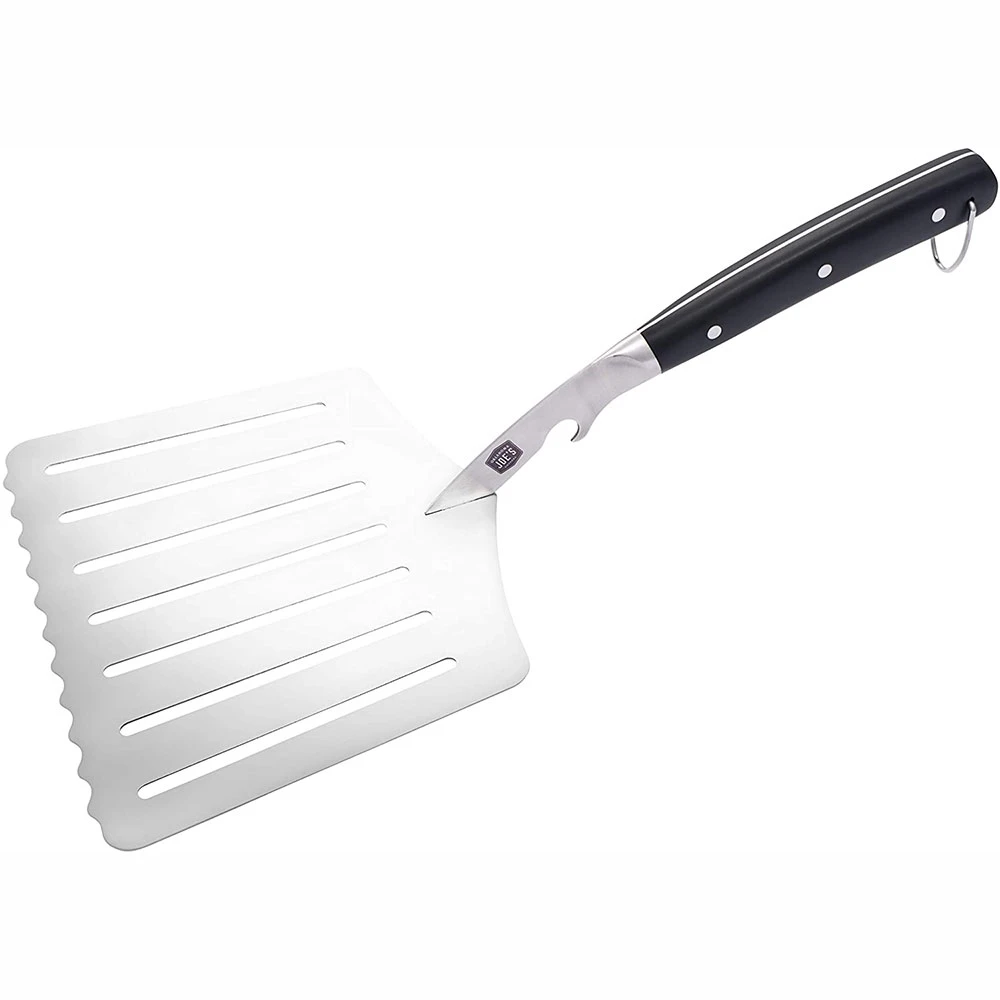 The Oklahoma Joe’s 3959563R06 Blacksmith Hawg Lifter makes handling heavy cuts of meat easier than ever before. Its oversized head is designed to pick up brisket, Boston butt and other large cuts with minimal effort, while it’s short, the vertical handle provides control and strength. Scalloped edge allows you to lift food from underneath versus scraping across the bottom. Custom Oklahoma Joe’s notch to hang or use as a bottle opener. Riveted, full-tang handle delivers increased stability