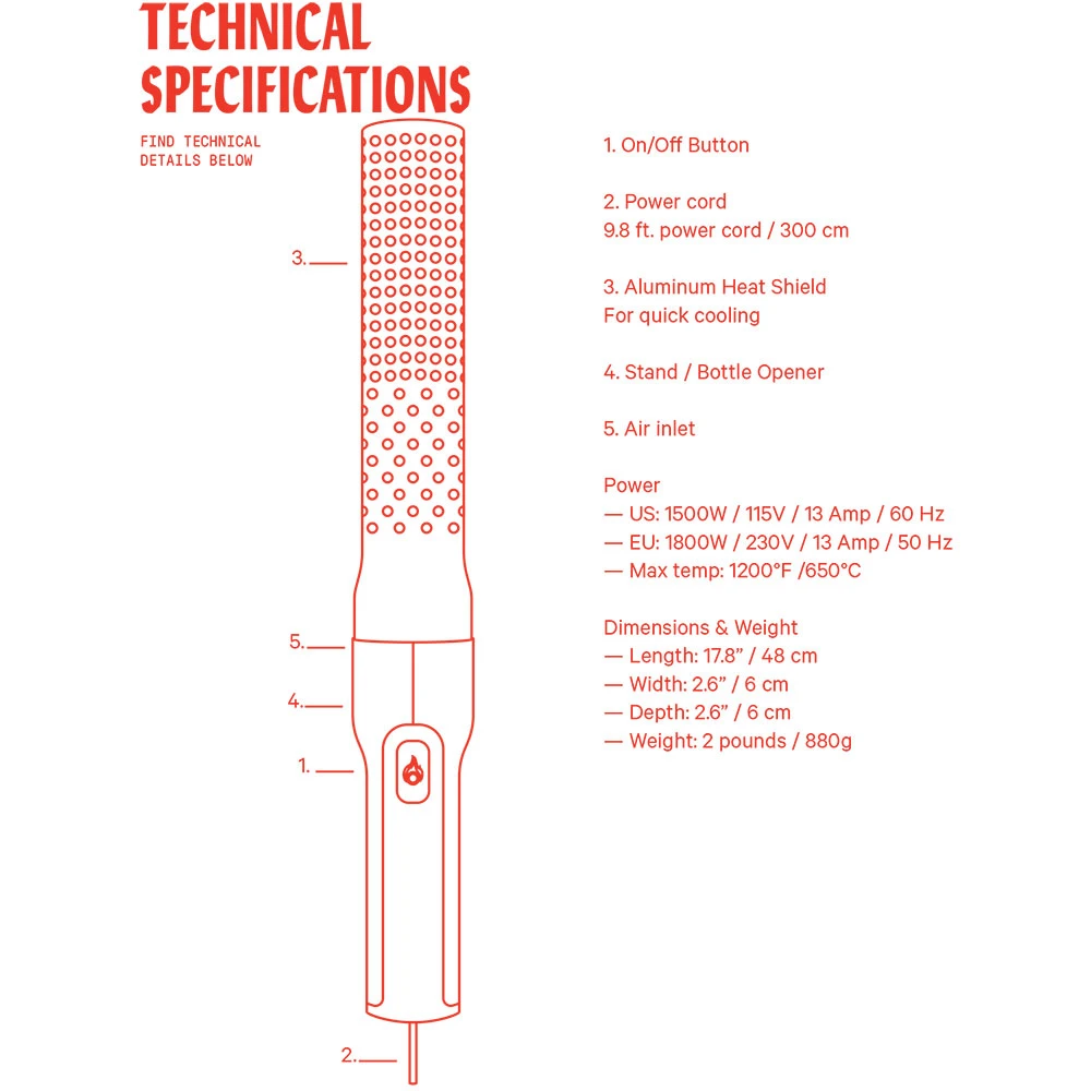 The Original Looftlighter is the most efficient, quickest, safest, and cleanest way to ignite charcoal and wood. The Original Looftlighter is fast – like seriously fast! An Original Looft Lighter can reach temperatures of 1200 degrees and gets your charcoal ignited in under 60 seconds. The Original Looft Lighter is safe – no gas, no flame, no smell, and no lighter fluids means that you rule the fire with nothing more than super-heated air. The Original Looftlighter is clean – with an Original Looft Lighter there’s no CO2 emissions and no toxic chemicals. Lighter fluid is a distant smelly memory. The Original Looftlighters versatile design makes it perfect for your backyard charcoal grill, a wood-fired pizza oven, fireplace logs (indoor or outdoor), and charcoal briquettes. With the Original Looft Lighter, you’ll get that perfect glow smoldering in no time. To use the Original Looft Lighter simply place the tip of the Original Looftlighter into a pile of fuel of your choice (charcoal, wood chips or logs), keep the Original Looftlighter in the same spot for 60 seconds, when sparks or a glow appear, pull back a few inches and let it sit for roughly 60 more seconds, your fuel is now hot and ready to go. It’s that simple!