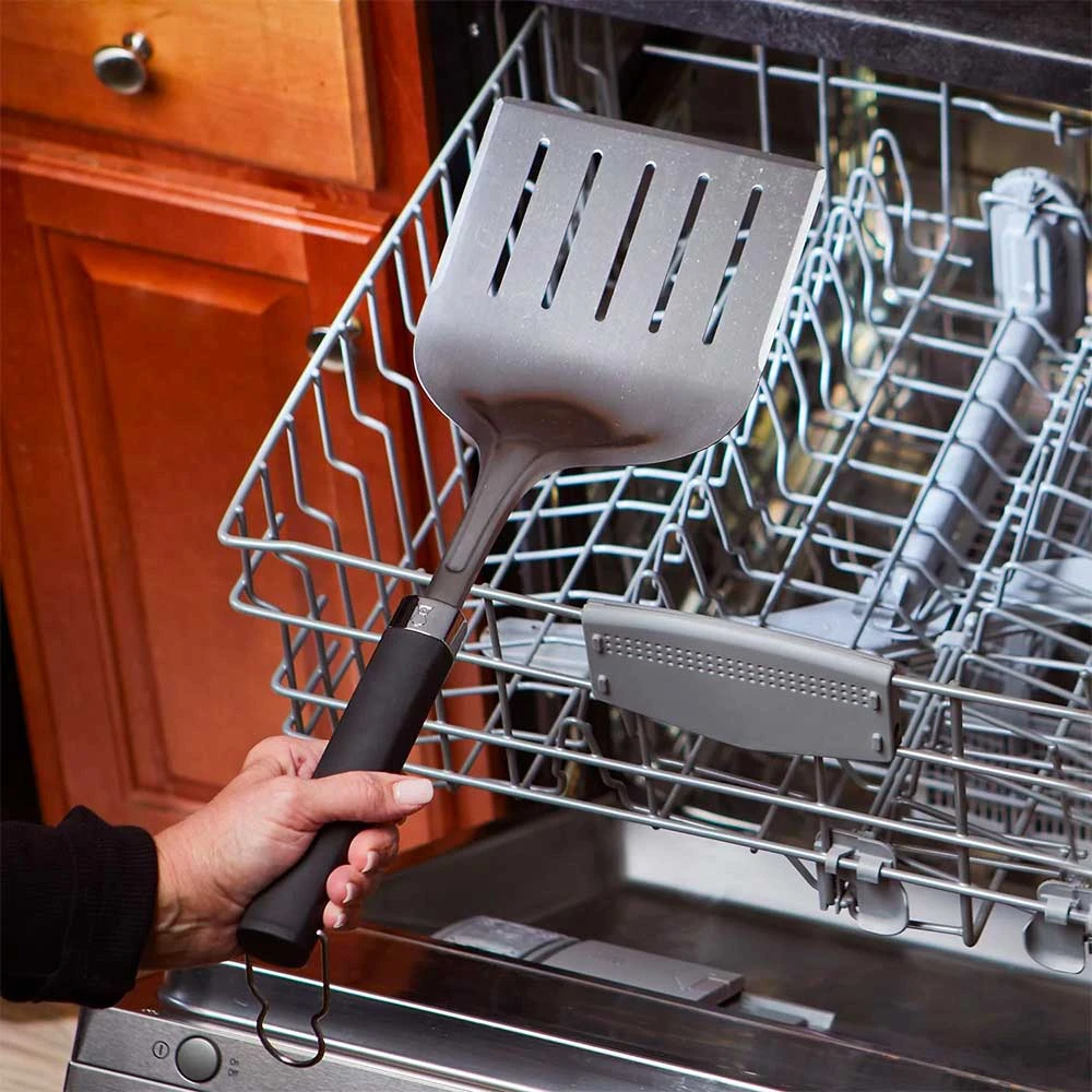 Lift and move large cuts of meat or delicate fish with ease. The wide grill spatula features a 3-sided beveled edge design that allows you lift foods with precision from any angle. The heavy-duty stainless steel construction and soft-touch handle provide control as the oversized head picks up large cuts or fragile foods with minimal effort.